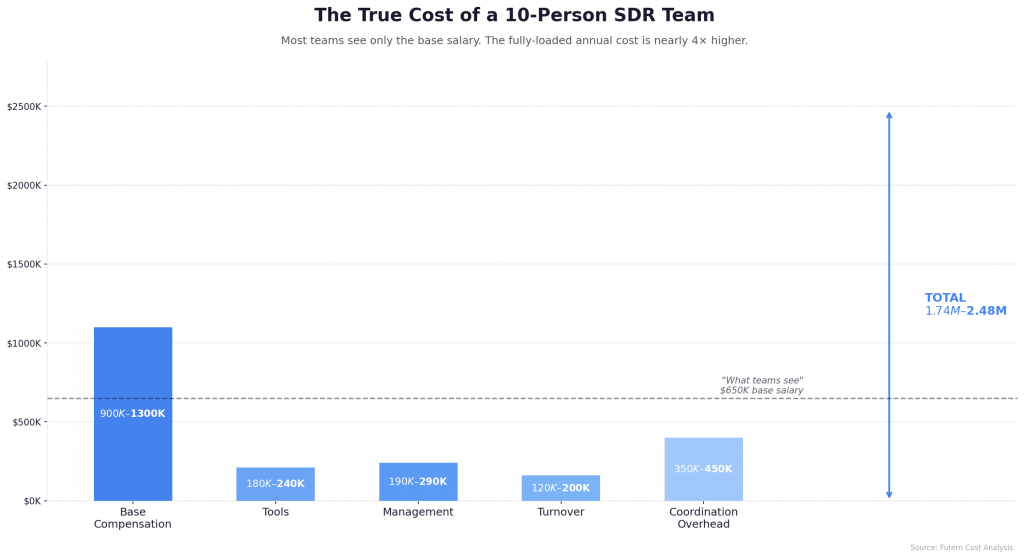 SDR Manager (fully loaded): $120-180K RevOps support allocation: $40-60K VP Sales time allocation: $30-50K Total management: $190-290K annually