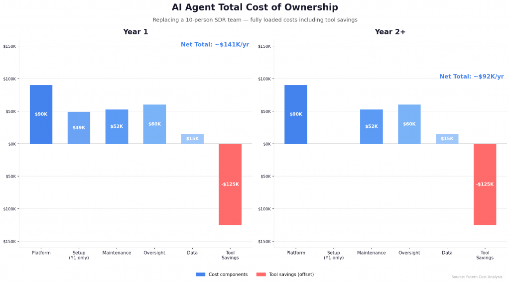 "AI agent costs $93-190K Year 1, $55-130K Year 2+. Delivers 2x more qualified meetings at 1/4 the cost per meeting. Enables 24/7 global coverage."