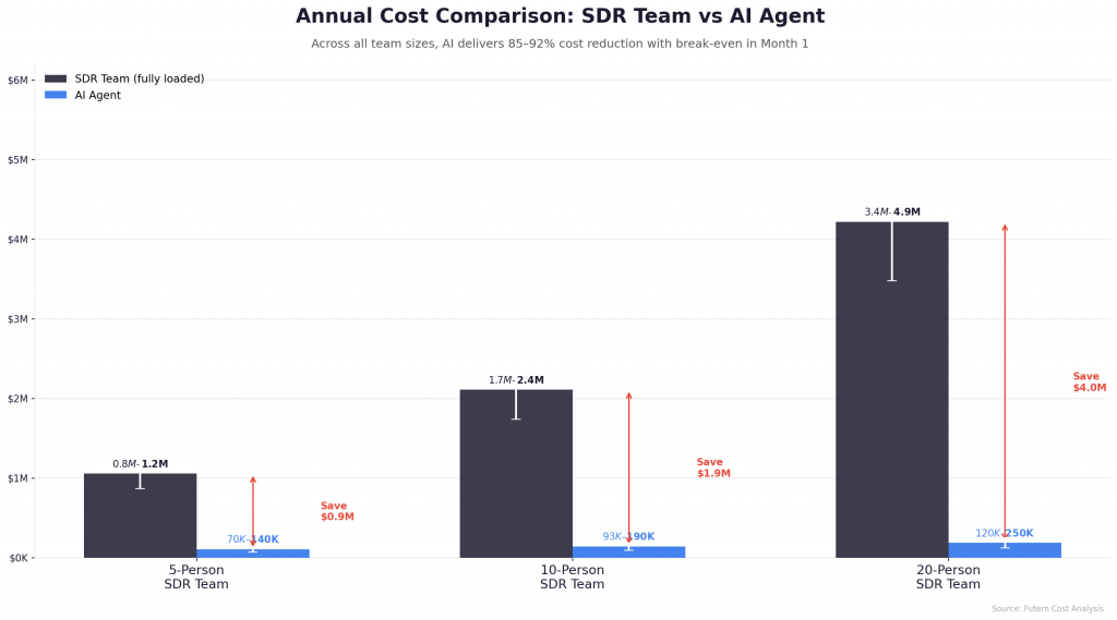 Key insight: The larger the SDR team, the more dramatic the savings. A 20-person team saves $3-4M+ annually.
