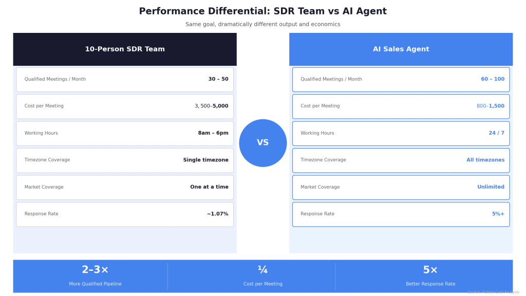 Real numbers: 10 SDRs cost $1.7M-2.5M annually. AI agent: $93K-190K. Same output, 85-92% cost saving…