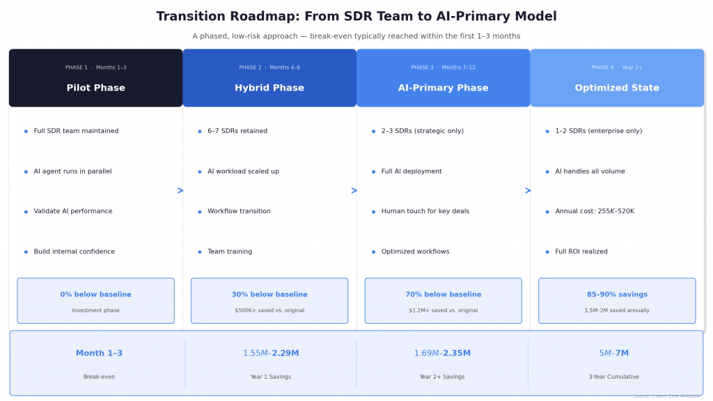 90-day pilot with limited investment. Keep SDRs during pilot. Clear success metrics: meeting volume and cost. Rollback option if performance doesn't meet targets. Maximum downside: $40-80K pilot cost.